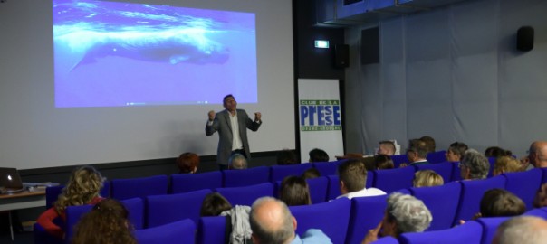 La salle de projection de la Cartoucherie à Bourg-lès-Valence a vibré au son des clics et codas des cachalots des abords de l’île Maurice ce jeudi 5 octobre. Devant une soixantaine de spectateurs captivés, le docteur en océanographie François Sarano – invité par le club de la presse Drôme-Ardèche – a dessiné avec son corps et devant des images de cachalots les rencontres étonnantes de son groupe de plongeurs avec ces mammifères carnivores.